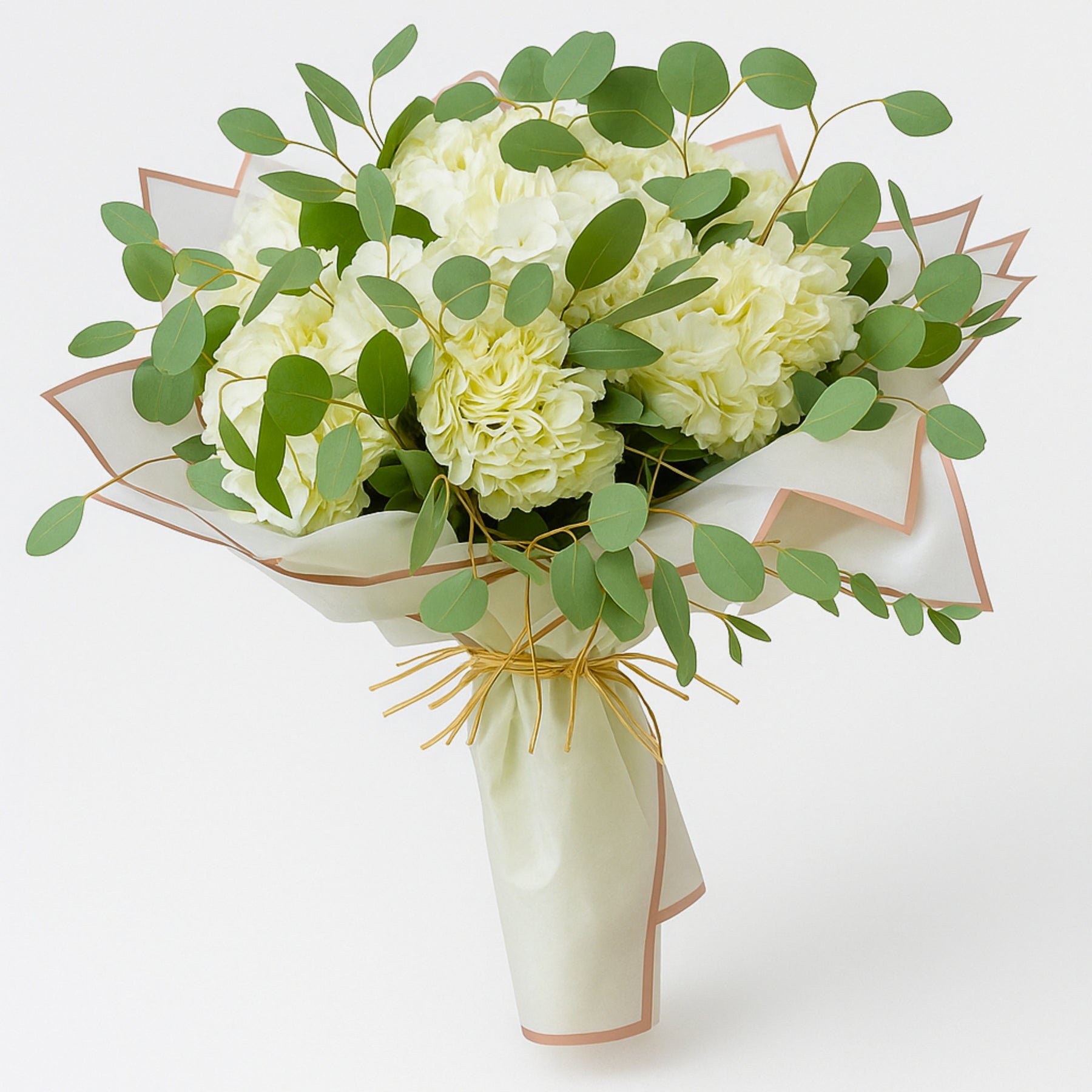 Experience timeless elegance with this Luxury Bouquet of White Hydrangea from Elegant Flowers. Designed with fresh, voluminous blooms and paired with lush greenery, this Luxury Bouquet of White Hydrangea makes a sophisticated statement for weddings, anniversaries, and special celebrations.